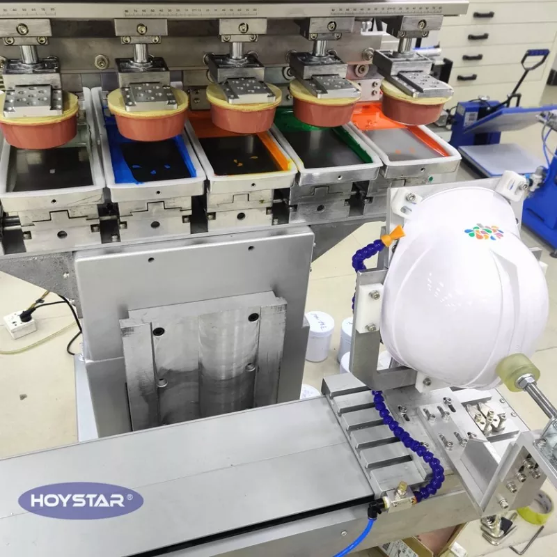 As the professional China manufacturer and supplier, HOYSTAR 6 Color Safety Helmet Pad Printing Machine equipped with PLC touch screen control panel easy to operation. This machine engineered for printing on curved and irregular surfaces like helmets. This versatile machine is ideal for a range of industries including Safety and protective equipment, sports equipment, automotive parts, promotional items, electronic casings, and toys. And have adjustable table height to accommodate various product dimensions.