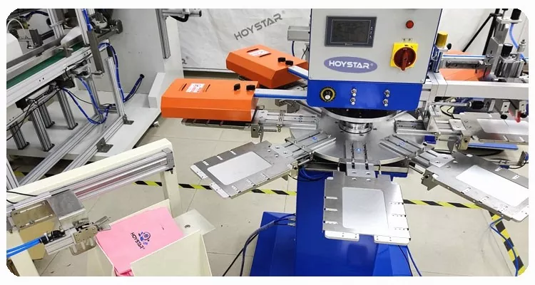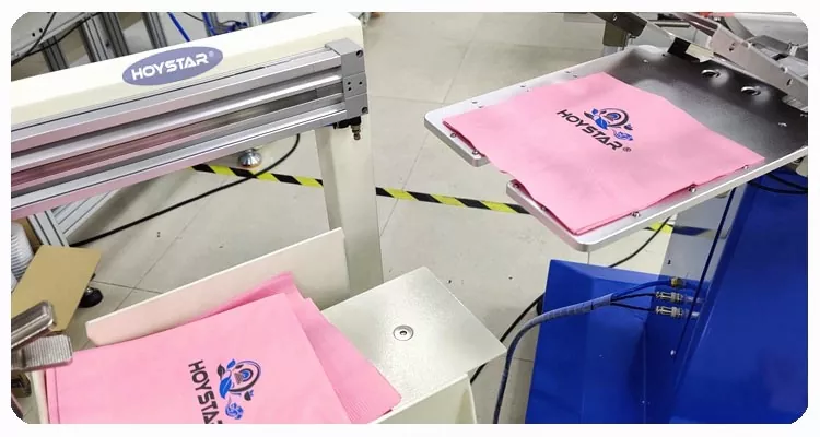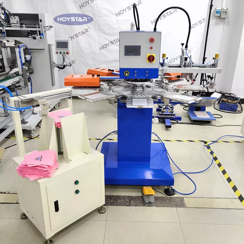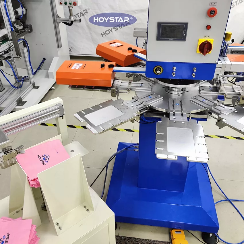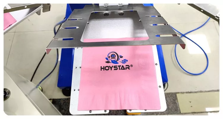HOYSTAR is a reliable manufacturer and supplier in China;This HOYSTAR Automatic 2 Colors Napkin Screen Printing Machine is specifically designed for fully automatic printing on napkins. Its streamlined printing process unfolds as follows: manually load the napkins onto the machine—automatic printing of the first color—automatic drying—automatic printing of the second color—automatic drying—automatic unloading—and automatic product collection.