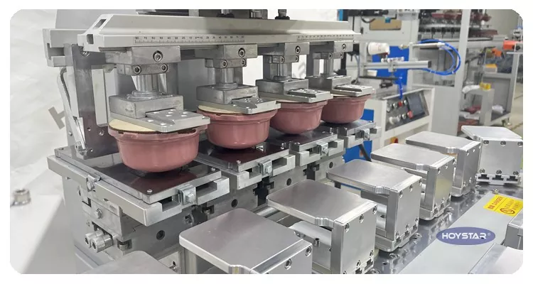 As the professional manufacturer in China, we would like to provide you high-efficiency HOYSTAR Big Size Four Color Pad Printer With Conveyor. This machine enables continuous four color pad printing for products, can make color registration completed in a single cycle. This machine adopts rotary turntable conveying system, which enables continuous and smooth product transfer throughout the printing process, ability to complete full 4 color overprinting in just one rotary cycle. Compared with shuttle-type pad printers, it’s speed is very fast.