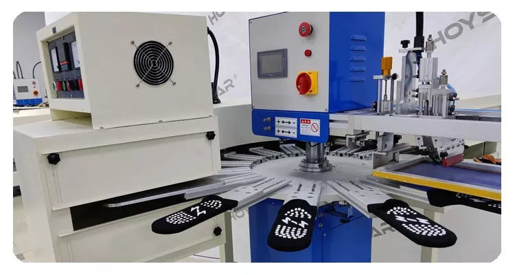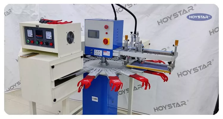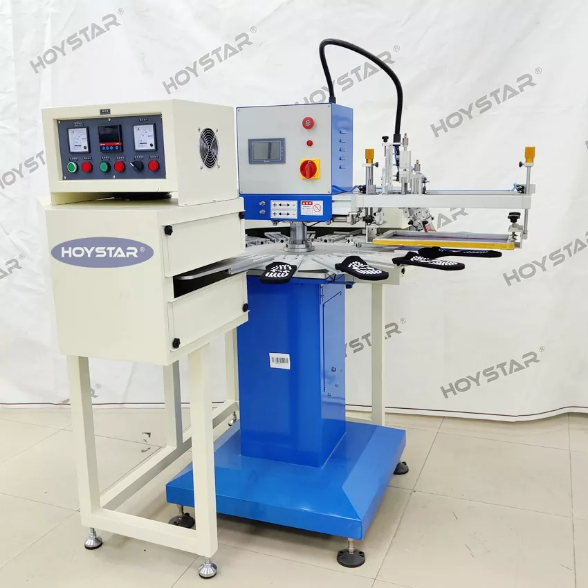 As the professional manufacturer and supplier, This HOYSTAR High Rapid Large size Socks Silk Screen Printing Machine is designed for applications in the textile knitting industry. With a speed of up to 1200PCS/Hr, it is suitable for printing non-slip socks, baby socks, adult socks, soccer socks, etc. Equipped with rotary worktable and 16 workstation, it is very convenient to load and unloading socks. PLC touch screen control, very easy to operate. Machine equipped with drying system can dry the silicon and ink well.