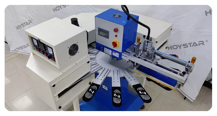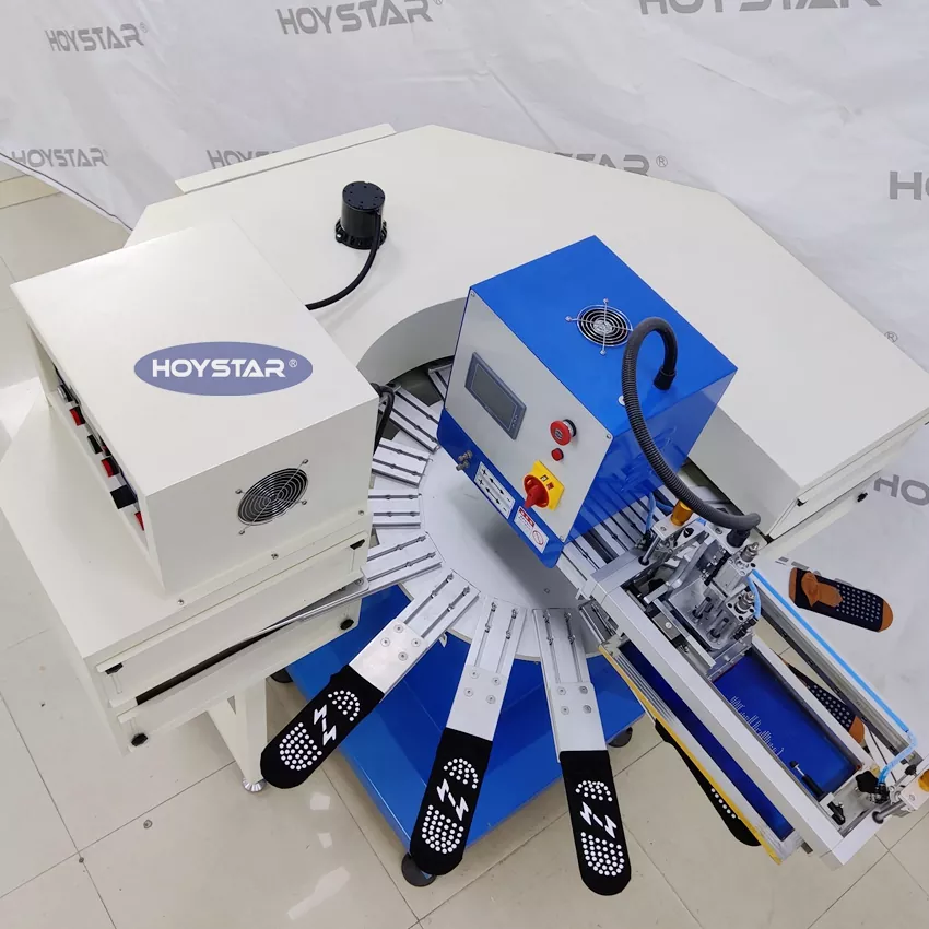 As the professional manufacturer in China, we would like to provide you with high rapid HOYSTAR Large size Socks Silk Screen Printing Machine. This come with 16 workstation machine suitable for high-volume production. It features advanced PLC and touch screen control can print sock soles and heels. An integrated IR drying tunnel ensures effective drying of silicon and ink