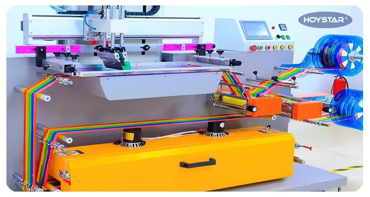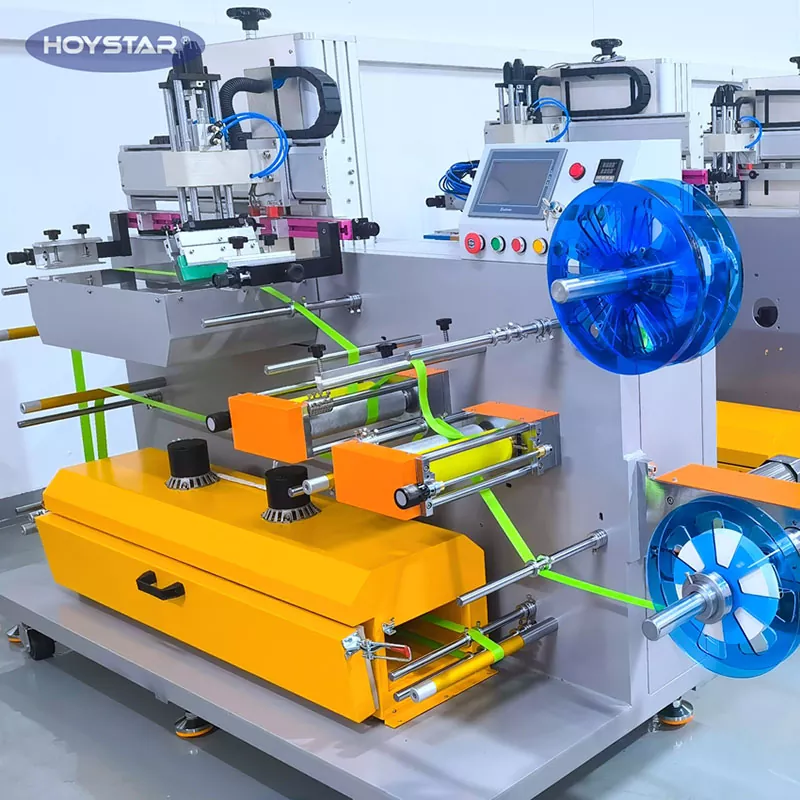 HOYSTAR is a reliable manufacturer and supplier in China; This HOYSTAR Roll To Roll Screen Printing Machine is designed for printing on various ribbon. Double reel mode ensures stable feeding and smooth production. PLC touch screen control, user-friendly interface for safe, intuitive operation. Double-layered drying oven with hot air circulation can dry the ink quickly and evenly.