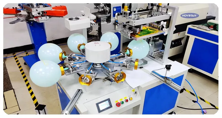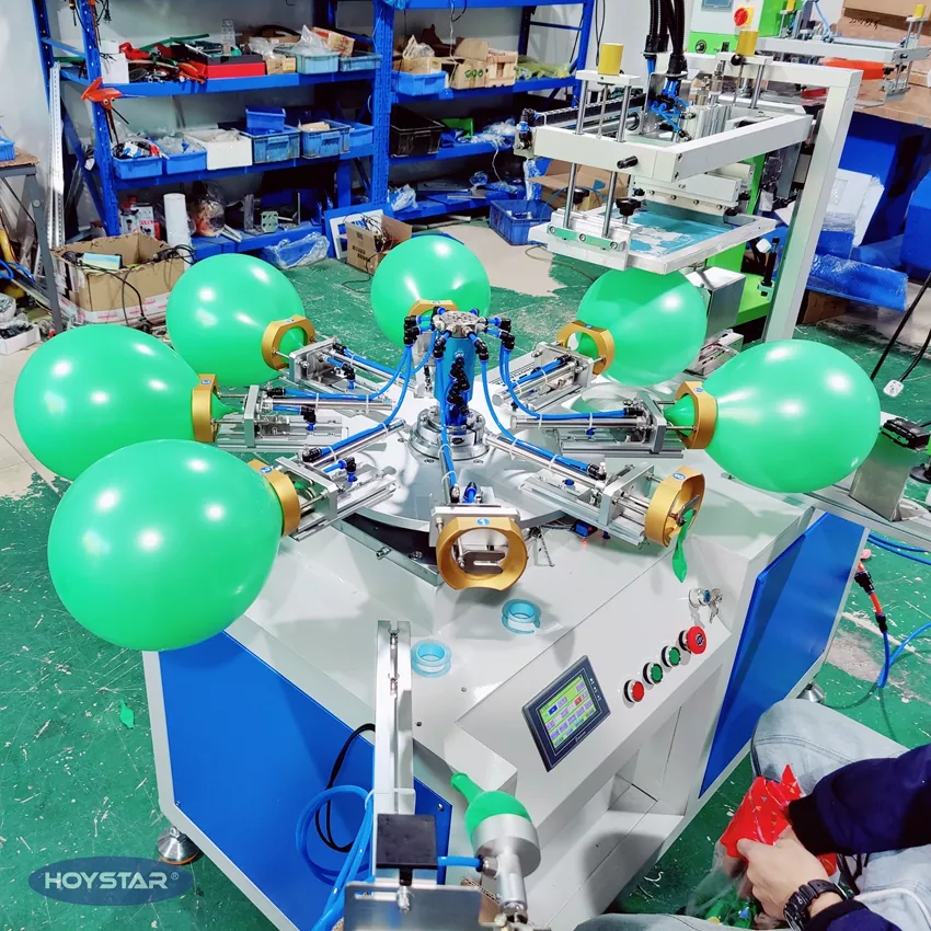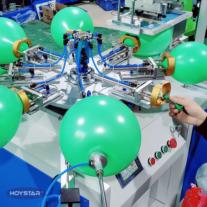 HOYSTAR is a reliable manufacturer and supplier in China; This HOYSTAR Single Color Latex Balloon Screen Printing Machine is designed for printing on latex balloons. Equipped with rotary worktable, automatic blowing, automatic rotating, automatic drying, automatic unloading functions. PLC touch screen control, user-friendly interface for safe, intuitive operation. The machine combines speed, precision and ease of use.