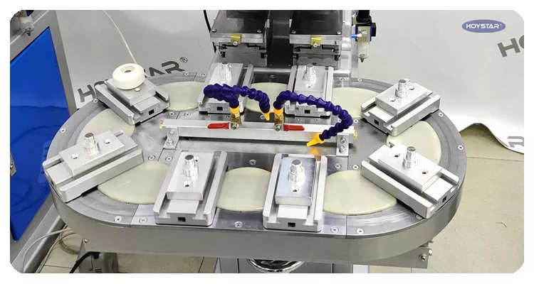 As the professional manufacturer in China, we would like to provide you high-efficiency HOYSTAR Two Color Rotary Table Pad Printing Machine. This machine enables continuous two color pad printing for products, with one color registration completed in a single cycle. Compared with shuttle-type pad printers, it’s speed is very fast. Suitable for printing on a variety of items, including electronic products, plastic shells, hardware products, stationery, and logos on the surface of small arts and crafts, can meet your two color printing demands.