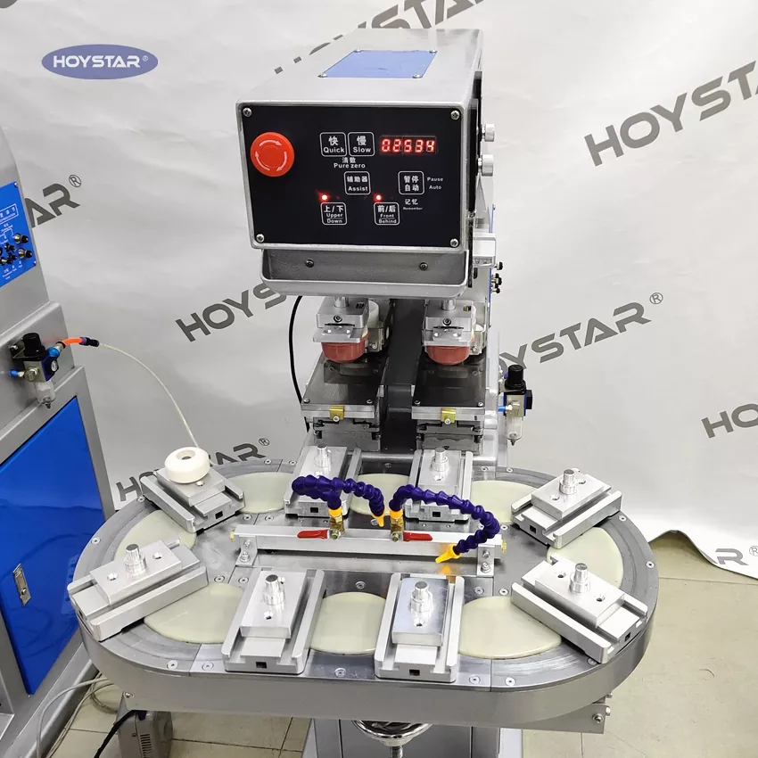HOYSTAR is a reliable manufacturer and supplier in China; HOYSTAR Two Color Rotary Table Pad Printing Machine is a high-capability and cost-effective printing equipment. The machine offer convenient adjustment, stable operation and good printing effect. The machine delivers steady printing quality and suitable for printing a wide range of items such as electronic products, plastic shells, hardware products, stationery, small arts and crafts, as well as the small logos on the surface of gifts and more. Can meet diverse two color printing requirements of customers.
